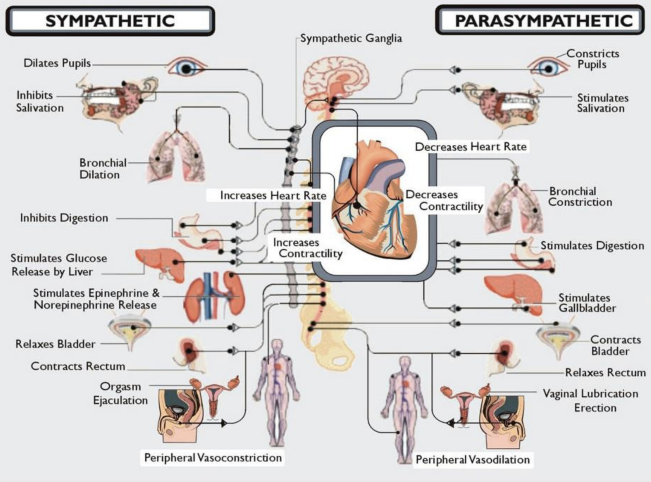 If you remember from biology class, the ANS is the part of the nervous system that works without a person’s conscious effort. Its responsibilities include things like controlling blood pressure, heart and breathing rates, body temperature, digestion, metabolism, urination/defecation, body fluid production, and sexual response (1). These are all things that your body does without you thinking about it.
