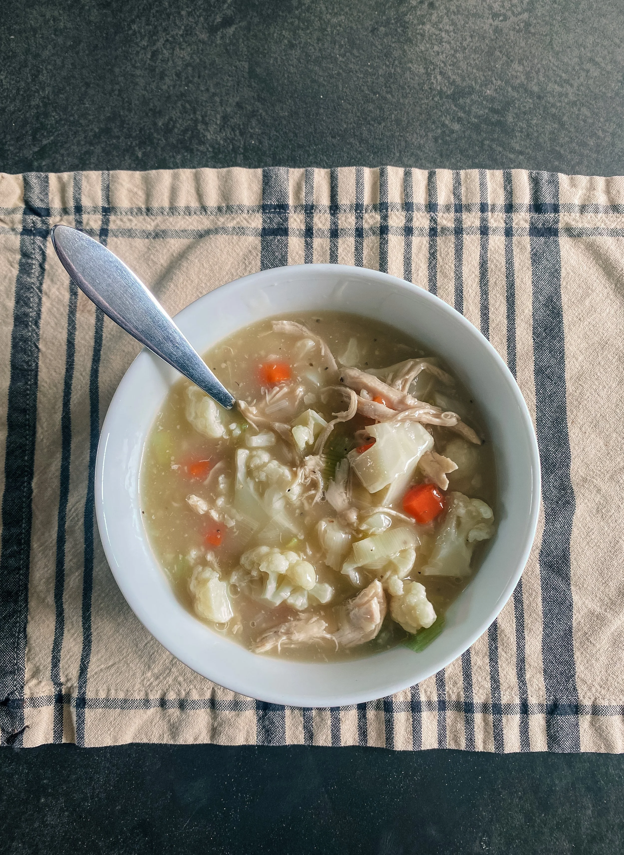 Start the soup by melting the ghee in a large stock pot over medium-low heat. Add the leeks and carrots to the pot and gently sauté for 5 minutes. Add the cauliflower, chicken and broth. Turn up to medium-high heat bringing broth to a gentle simmer. Add coconut milk. Using a blender bottle or a whisk, combine 2 cups of broth or water with the arrowroot powder. Pour arrowroot mixture to the pot and stir (all arrowroot powders thicken a little differently; if you notice it is too thin, repeat the process adding ¼ cup of arrowroot). After soup has thickened (it will take 5-10 min) pull it off the burner and add salt and pepper to taste. Enjoy!